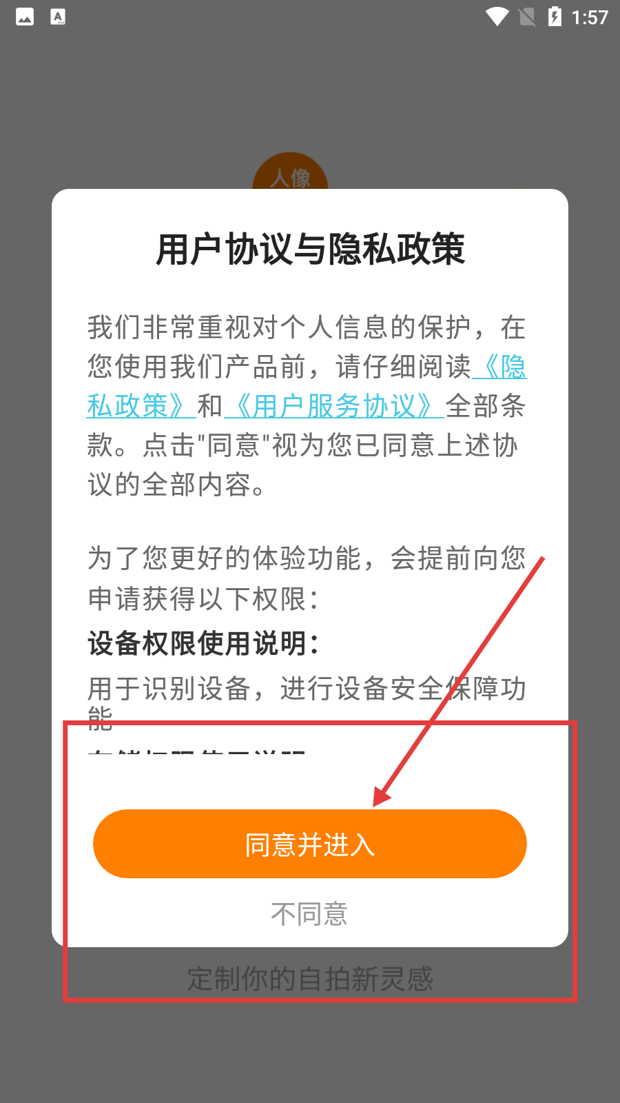 1、進入軟件時會彈出【用戶協(xié)議與隱私政策】彈窗,仔細閱讀后點擊【同意并進入】,即可進入主界面。