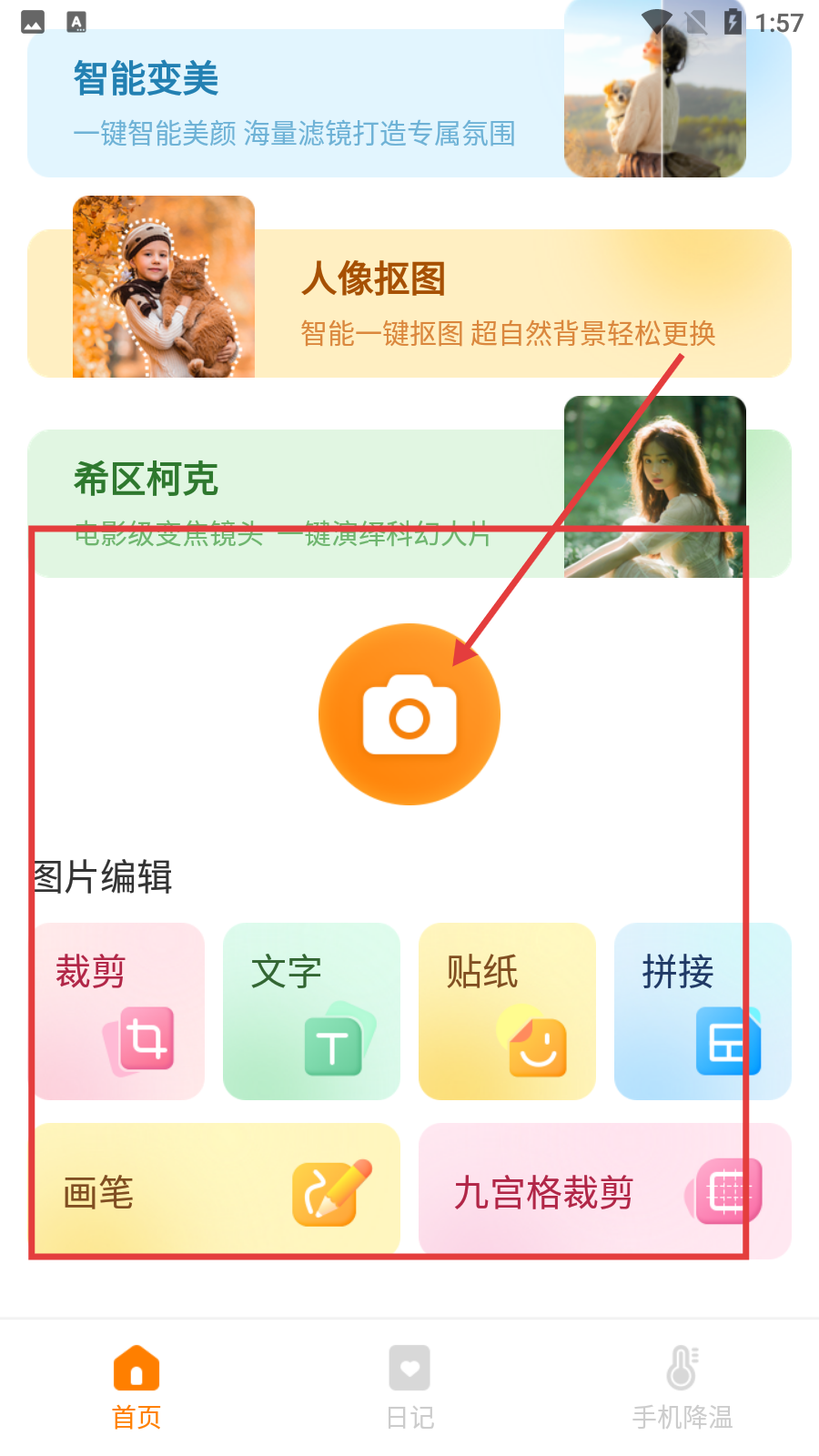 2、進入主界面后,可看到【智能】【人像摳圖】等功能,點擊中間橙色相機按鈕可進入拍攝界面。