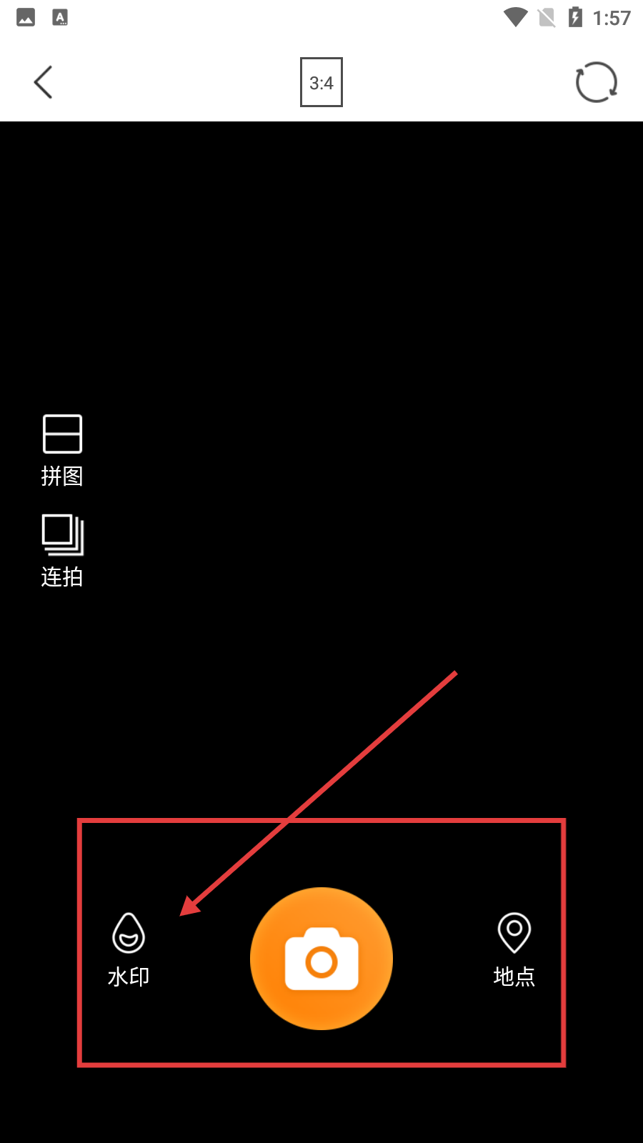3、在拍攝界面,左側(cè)有【拼圖】【連拍】功能,底部可選擇【水印】【地點】等設(shè)置,方便拍攝時添加元素。