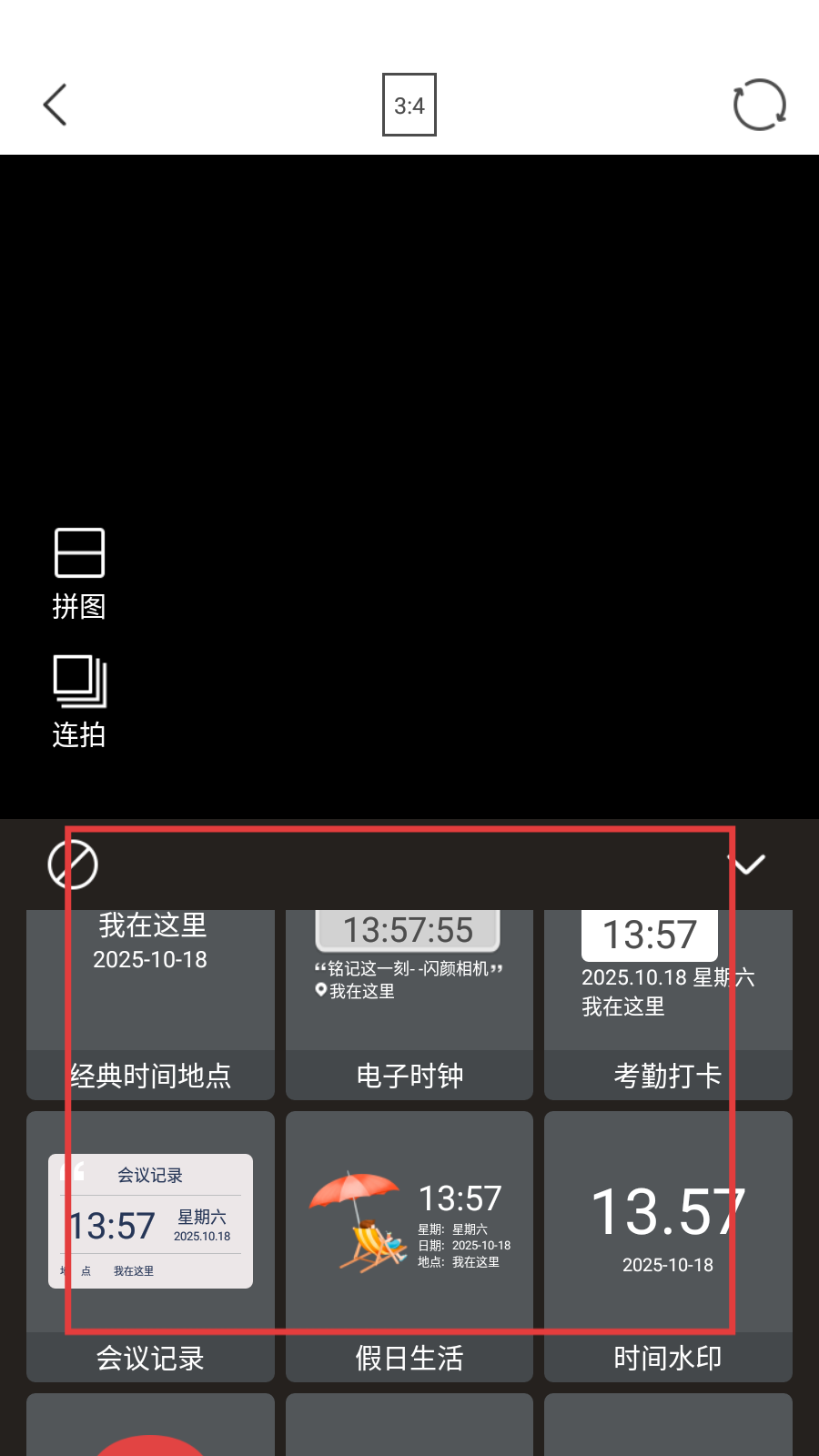4、點擊【水印】后,會出現(xiàn)【經(jīng)典時間地點】【電子時鐘】【考勤打卡】等多種水印樣式,可選擇喜歡的水印添加。