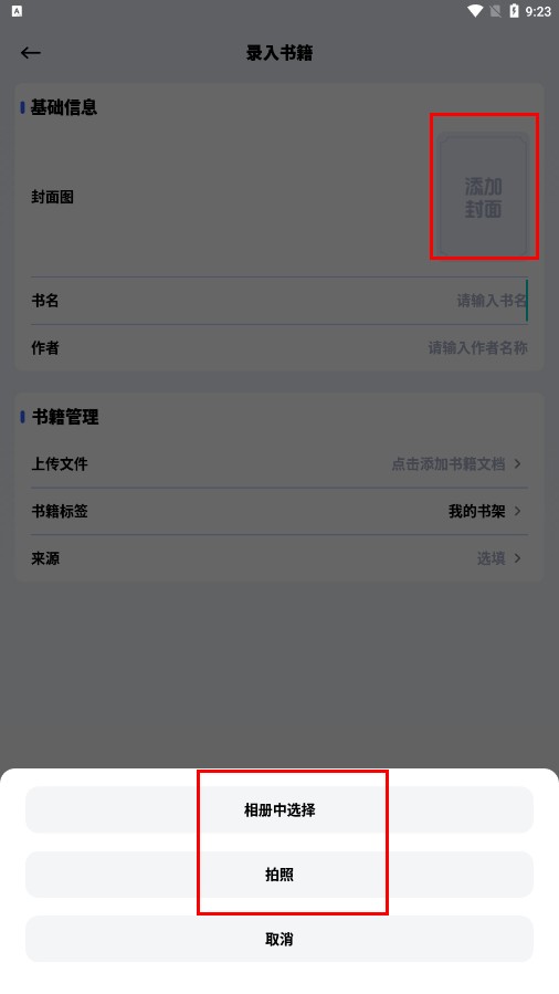 2、在錄入書籍頁面,點(diǎn)擊【添加封面-按鈕】,選擇從相冊里選擇或拍照來添加封面。