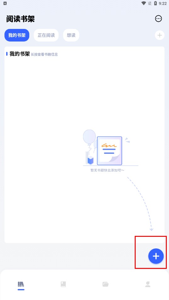 1、點(diǎn)擊閱讀書架右下角的【添加按鈕】,開始添加書籍。