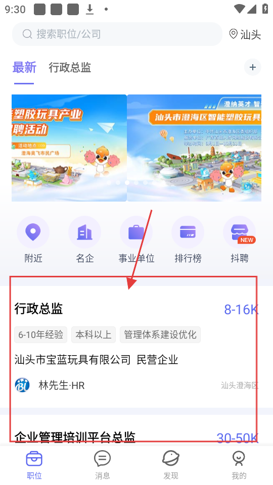 1、在職位頁面,有招聘職位如【行政總監(jiān)】,點(diǎn)擊它可進(jìn)入職位詳情頁,了解職位信息哦。