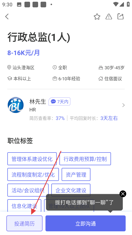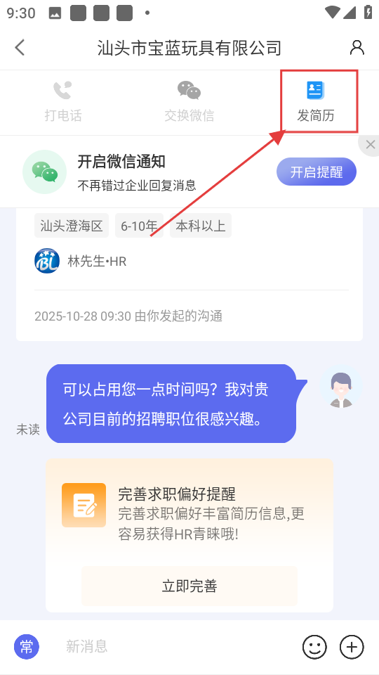 4、在溝通頁面,點(diǎn)擊【發(fā)簡歷】,可向HR發(fā)送簡歷,推進(jìn)應(yīng)聘流程啦。
