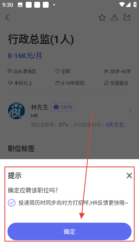 2、進(jìn)入職位詳情頁后,點(diǎn)擊【投遞簡歷】按鈕,可觸發(fā)應(yīng)聘提示彈窗,準(zhǔn)備確認(rèn)應(yīng)聘啦。