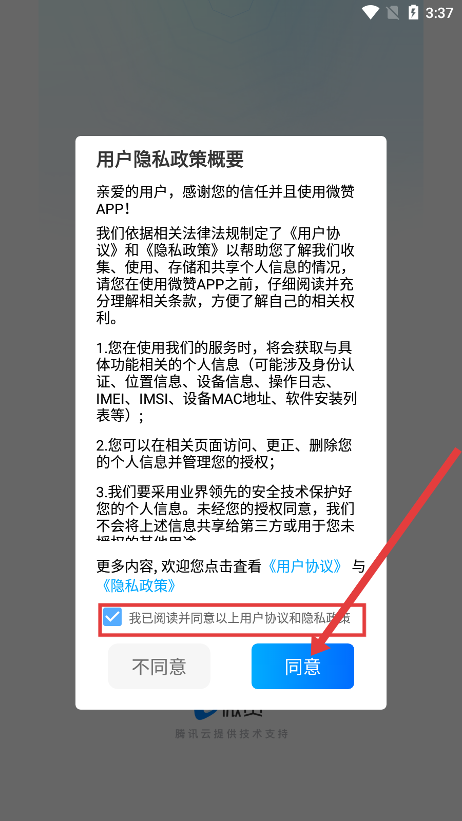 1、在APP的用戶隱私政策概要提示框中,勾選“我已閱讀并同意以上用戶協(xié)議和隱私政策”,點(diǎn)擊【同意】,進(jìn)入功能選擇頁(yè)面。