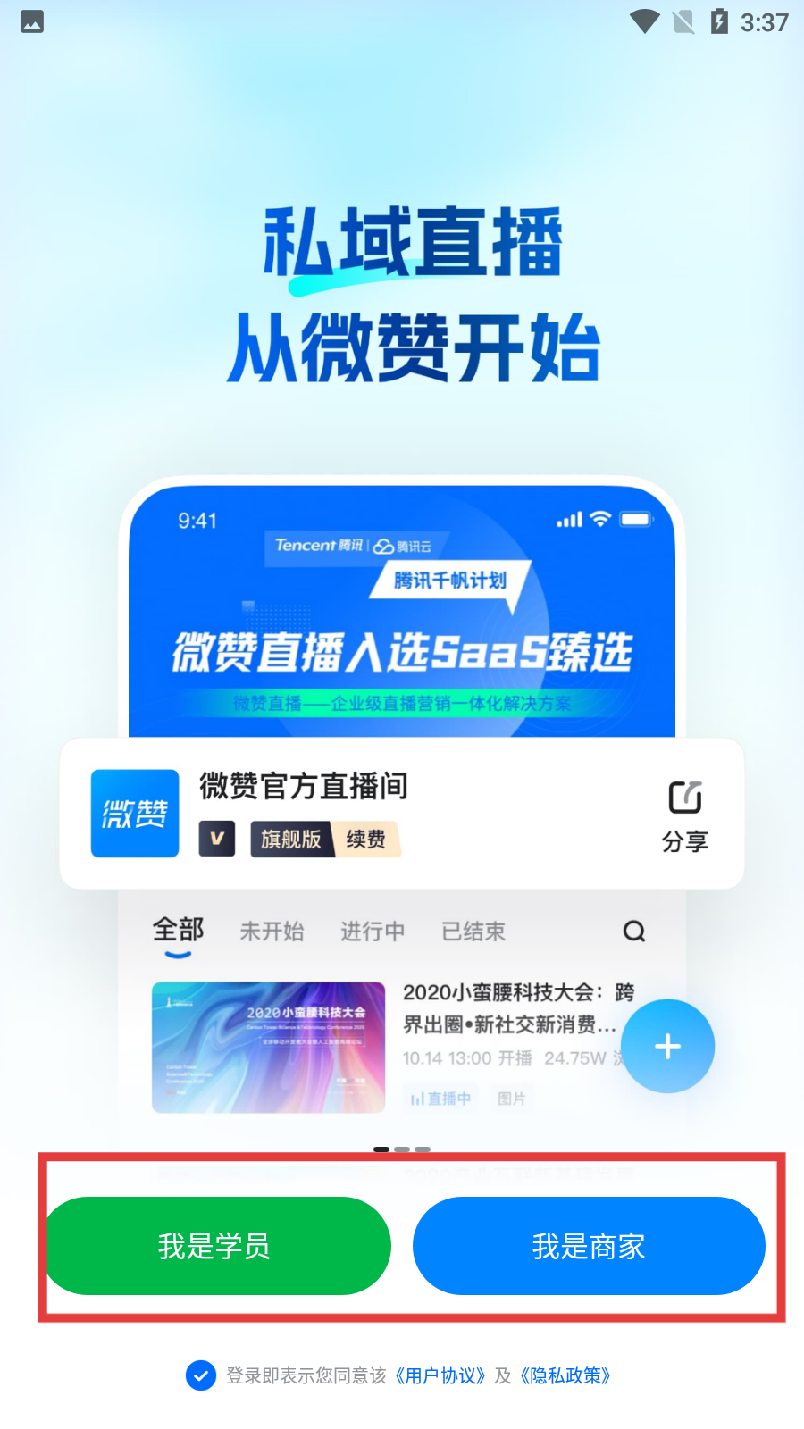 2、在功能選擇頁(yè)面,根據(jù)自身情況選擇【我是學(xué)員】或【我是商家】,進(jìn)入登錄頁(yè)面。
