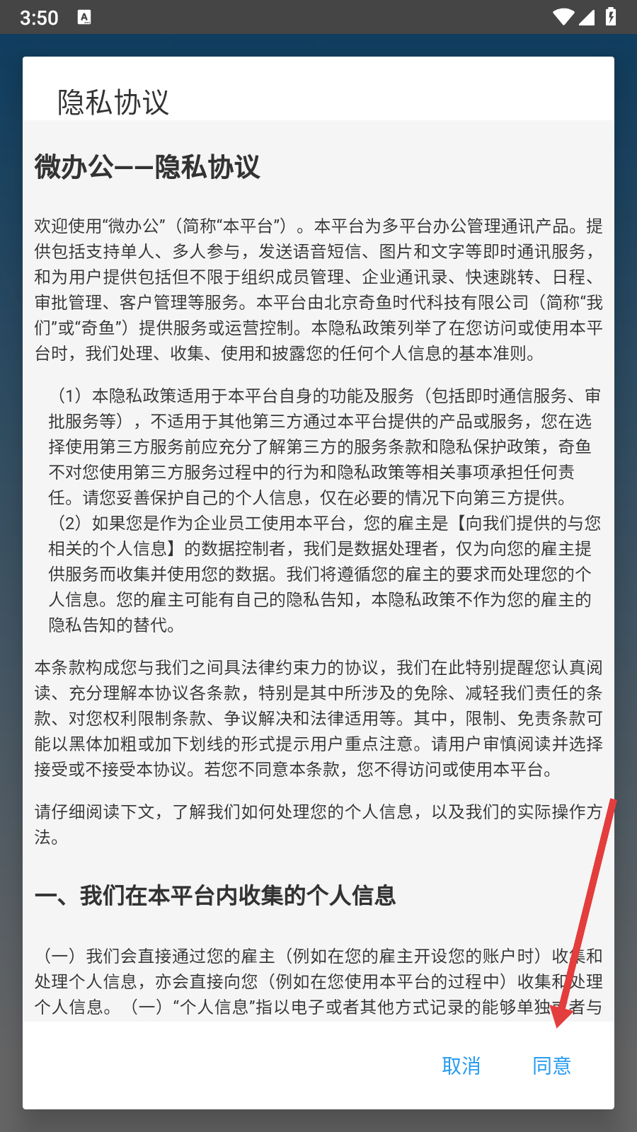 1、在微辦公APP的隱私協(xié)議提示框中,點(diǎn)擊【同意】,進(jìn)入功能選擇頁面。