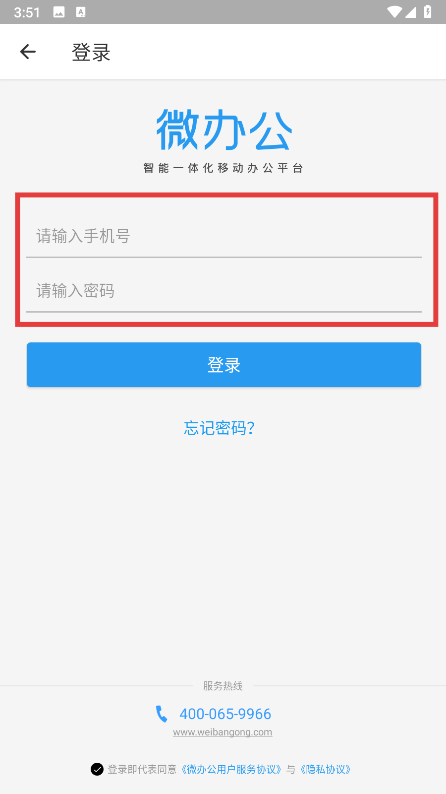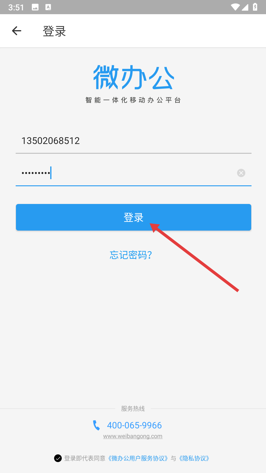 4、勾選同意《微辦公用戶服務(wù)協(xié)議》與《隱私協(xié)議》后,點(diǎn)擊【登錄】,完成APP的登錄流程。