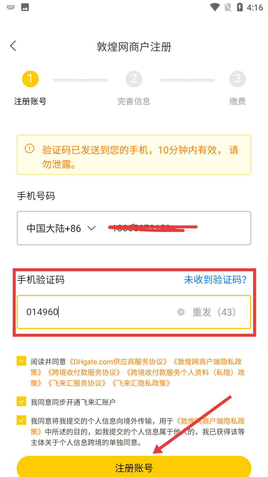 1、在敦煌網(wǎng)商戶注冊頁面,輸入手機號碼,獲取并填寫手機驗證碼,勾選相關(guān)服務(wù)協(xié)議后,點擊【注冊賬號】。