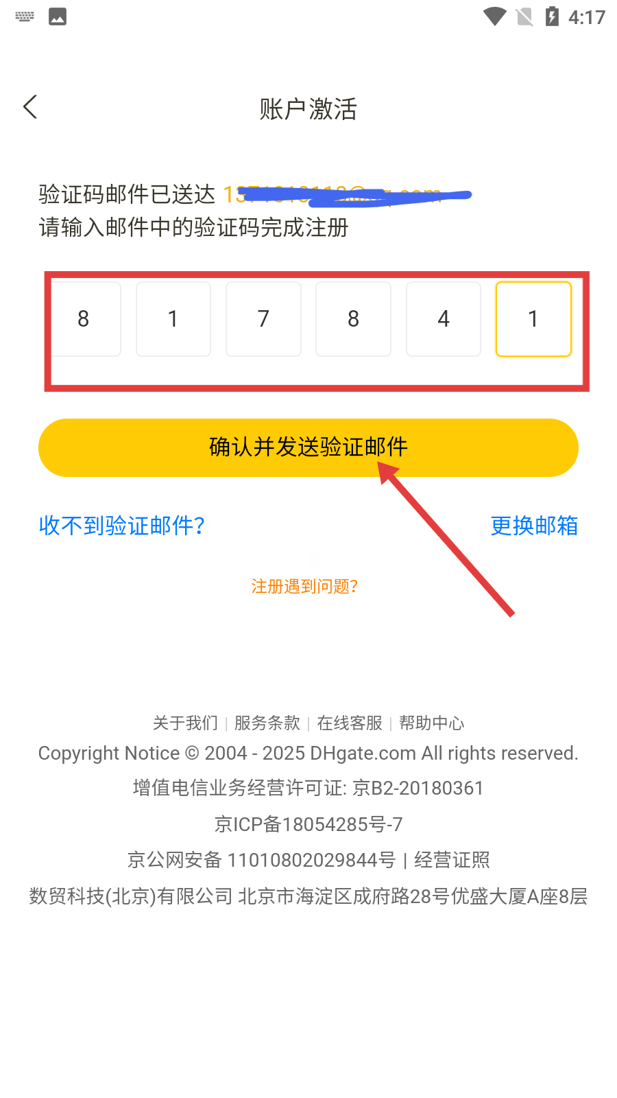 3、常用郵箱需要完成郵箱驗證,輸入郵箱中收到的驗證碼,點擊【確認(rèn)并發(fā)送驗證郵件】,完成賬戶激活。