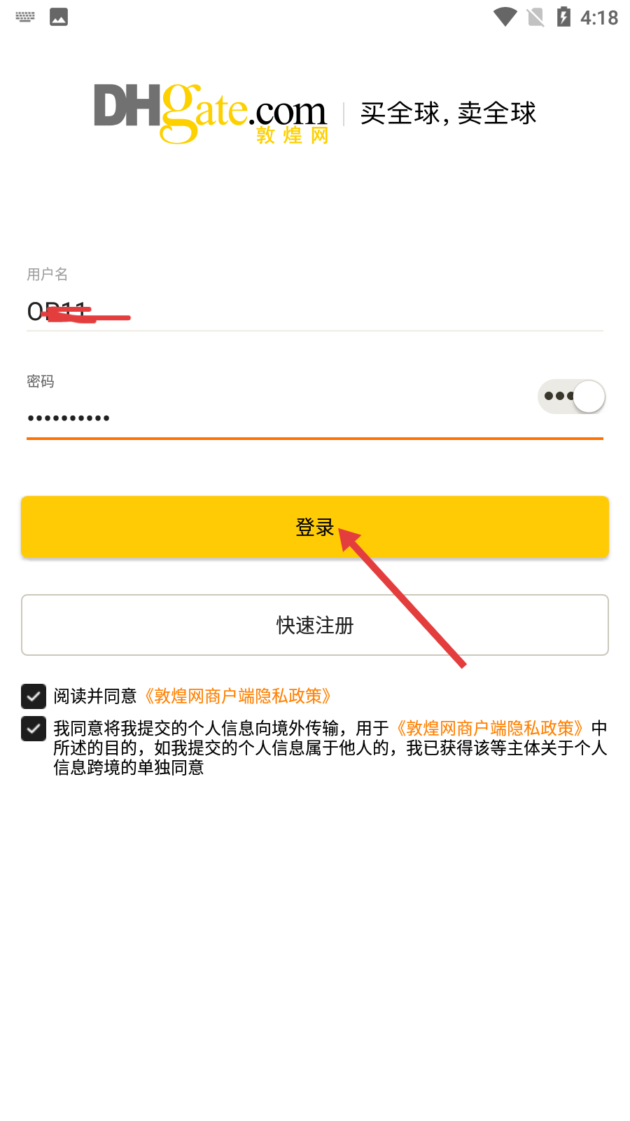 4、在登錄頁面輸入注冊成功的用戶名和密碼,勾選同意隱私政策等協(xié)議后,點擊【登錄】,進入敦煌網(wǎng)商戶平臺。