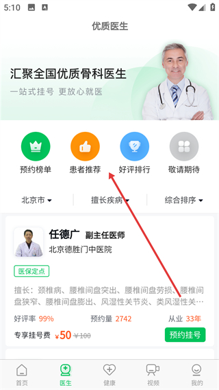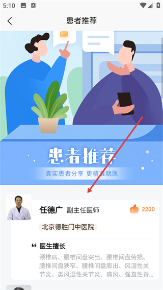 2、在優(yōu)質(zhì)醫(yī)生頁(yè)面點(diǎn)擊【患者推薦】,進(jìn)入患者推薦的醫(yī)生列表。