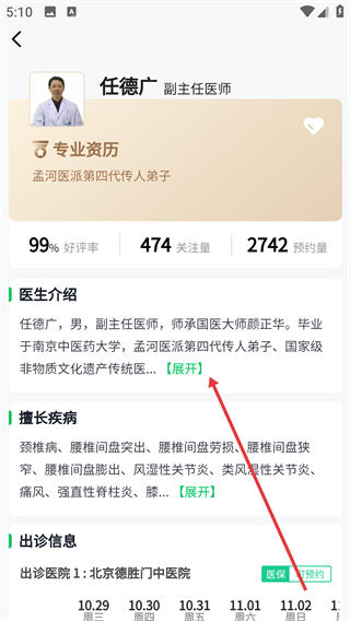 4、在醫(yī)生詳情頁(yè)面點(diǎn)擊【展開】,查看完整的醫(yī)生介紹、擅長(zhǎng)疾病等信息。