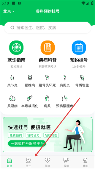 1、點(diǎn)擊底部【醫(yī)生】,進(jìn)入優(yōu)質(zhì)醫(yī)生頁(yè)面。