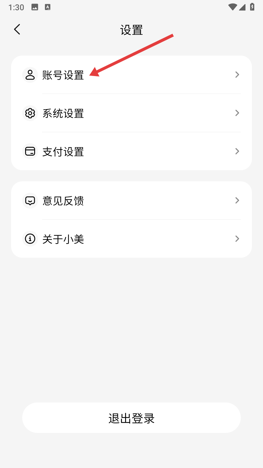 3、在設(shè)置頁(yè)面中,點(diǎn)擊紅色箭頭指向的【賬號(hào)設(shè)置】選項(xiàng),進(jìn)入賬號(hào)設(shè)置頁(yè)面。