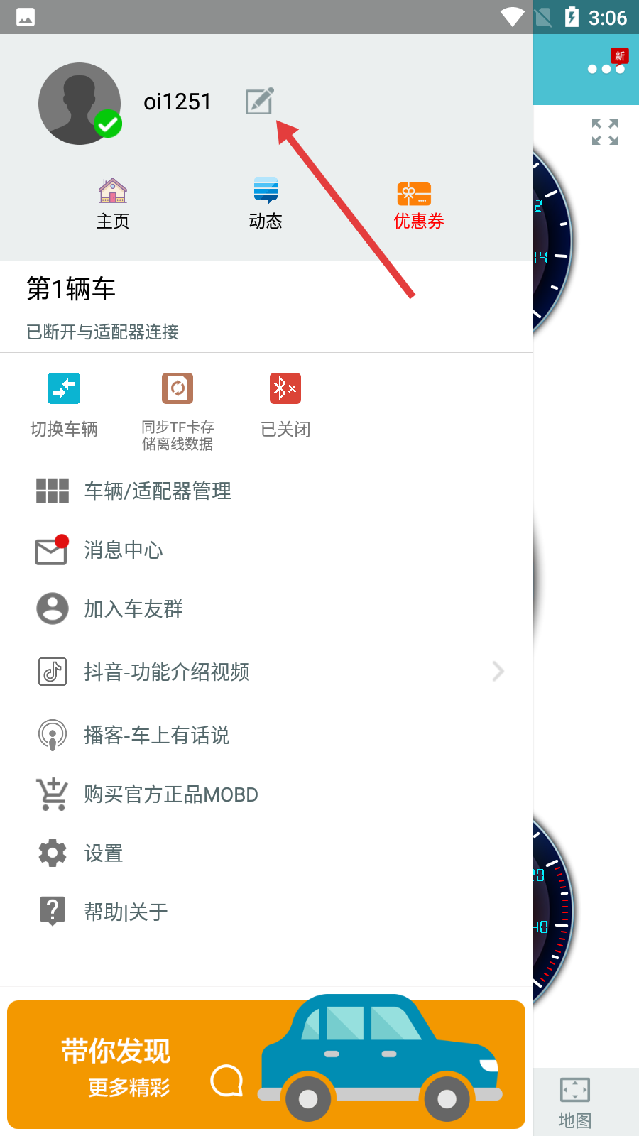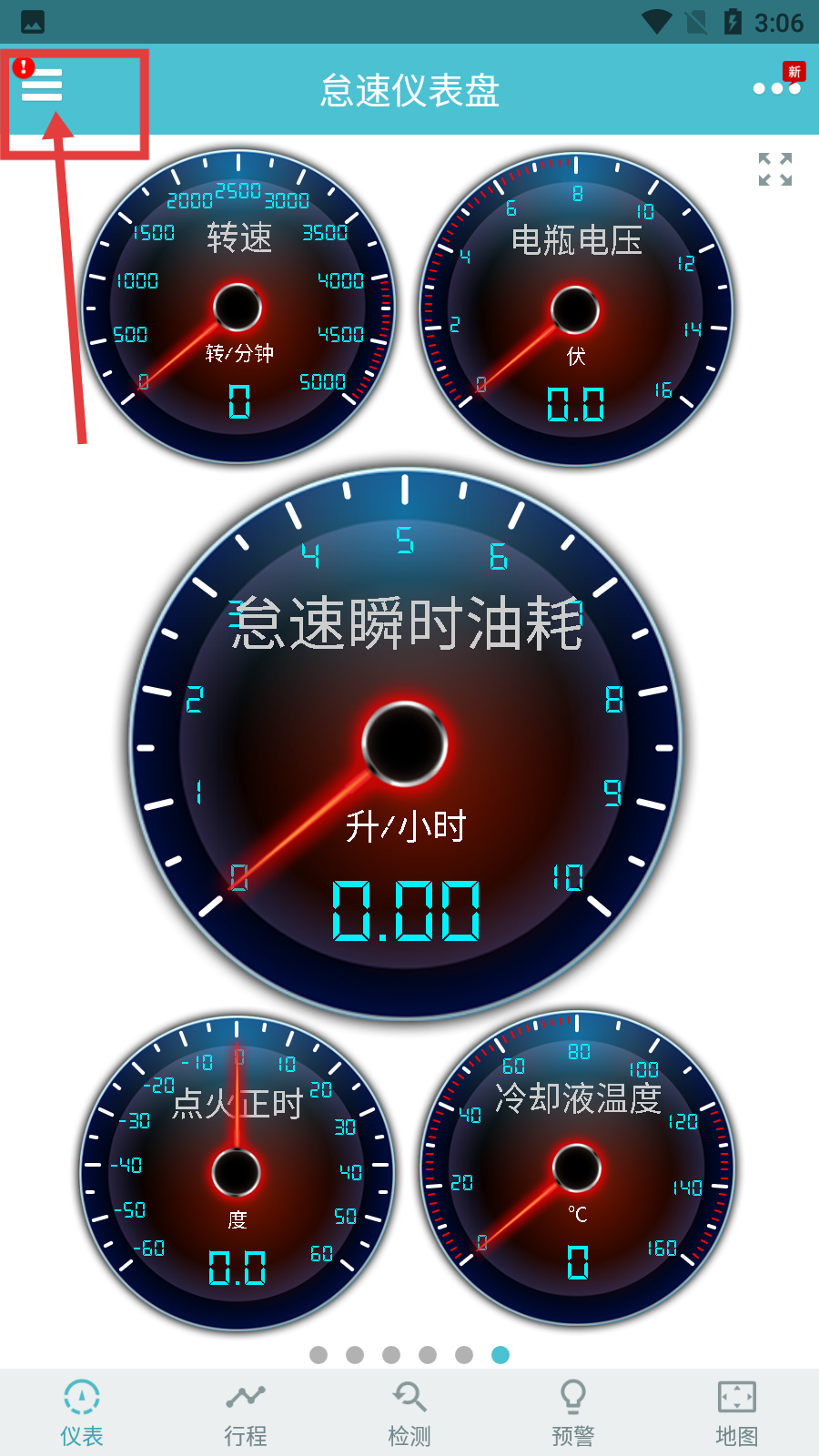 1、進(jìn)入【怠速儀表盤】界面后,點(diǎn)擊左上角帶感嘆號(hào)的【菜單】按鈕,展開功能菜單。