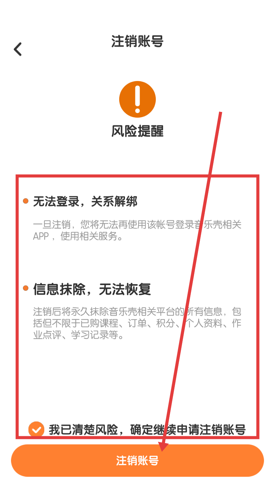 4、在注銷賬號頁面,仔細閱讀風險提醒后,勾選確認并點擊【注銷賬號】按鈕完成注銷。