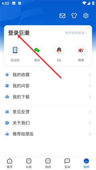 2、進(jìn)入【我的】頁面后,點(diǎn)擊【登錄巨潮】區(qū)域,可選擇多種登錄方式進(jìn)入登錄界面。