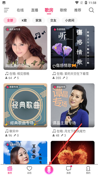 1、在K歌APP首頁,點(diǎn)擊底部麥克風(fēng)圖標(biāo),進(jìn)入歌曲選擇界面。