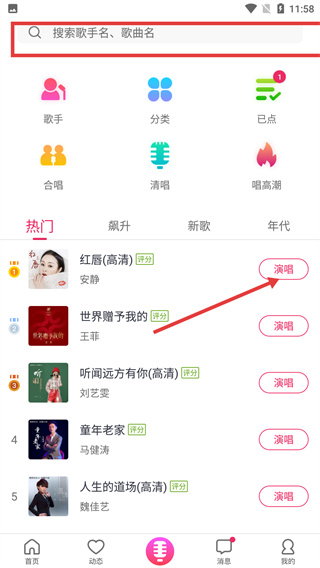 2、在歌曲選擇界面,搜索或選擇目標(biāo)歌曲,點(diǎn)擊【演唱】按鈕,進(jìn)入歌曲演唱準(zhǔn)備頁。