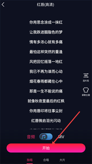 3、在歌曲演唱準(zhǔn)備頁,點(diǎn)擊【開始】按鈕,進(jìn)入演唱錄制環(huán)節(jié)。