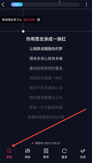 4、在錄制環(huán)節(jié),根據(jù)需求點(diǎn)擊【原唱】開關(guān),錄制完成后點(diǎn)擊【完成】結(jié)束錄制。