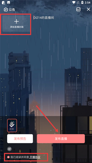 3、進(jìn)入開直播頁面后,添加直播封面,勾選【我已閱讀并同意-開播協(xié)議】,點(diǎn)擊【發(fā)布直播】。