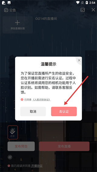 4、發(fā)布直播前會彈出溫馨提示,點(diǎn)擊【去認(rèn)證】。完成實(shí)名認(rèn)證后,即可正常發(fā)布直播。