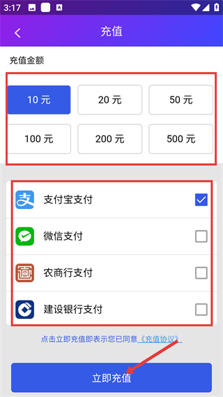 4、在充值頁面,選擇金額和支付方式,點擊【立即充值】完成操作。