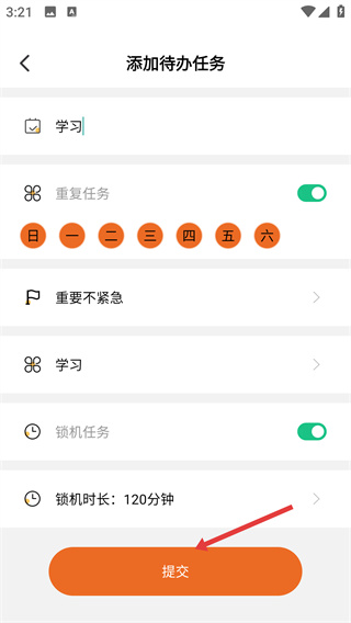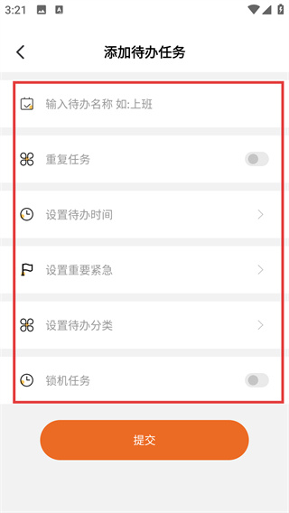 2、進(jìn)入添加待辦任務(wù)頁面,可設(shè)置【待辦名稱】、【重復(fù)任務(wù)】、【待辦時(shí)間】等屬性,完善任務(wù)信息。