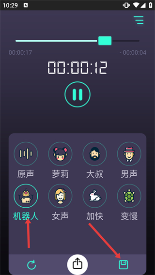 4、暫停錄制后,選擇“機(jī)器人”等目標(biāo)變聲效果,再點擊對應(yīng)按鈕切換至變聲配置界面,完成音頻的變聲處理。