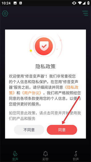 1、閱讀《隱私政策》與《用戶協(xié)議》后,點擊彈窗中的“同意”按鈕,進(jìn)入修音變聲器的主操作界面。