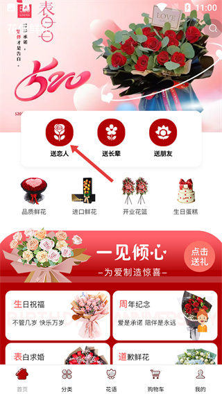 1、在APP首頁,點(diǎn)擊“送戀人”選項(xiàng),進(jìn)入面向戀人的鮮花商品列表頁面,可瀏覽對(duì)應(yīng)品類的花束。