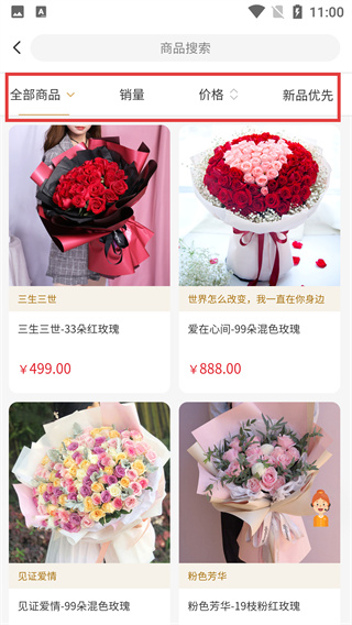 2、進(jìn)入送戀人的商品列表頁面后,可通過銷量、價(jià)格等維度篩選,查看不同款式的戀人鮮花商品。