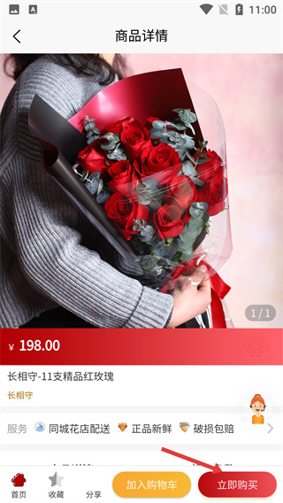 4、進(jìn)入鮮花詳情頁,確認(rèn)信息后點(diǎn)擊“立即購買”按鈕,發(fā)起該商品的購買流程。