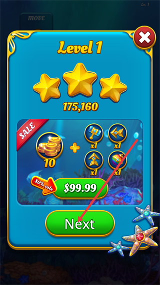 3、關(guān)卡目標(biāo)不止于“消除指定數(shù)量”,還包含“拯救被困小生物”“清理海底海藻”等海底主題任務(wù)。