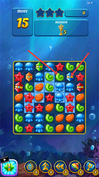 3、利用剩余【15】步,交換元素(如綠色海螺、藍(lán)色水母)讓藍(lán)色水母相連并消除,完成【mission-收集5個(gè)獎(jiǎng)杯】的任務(wù)。