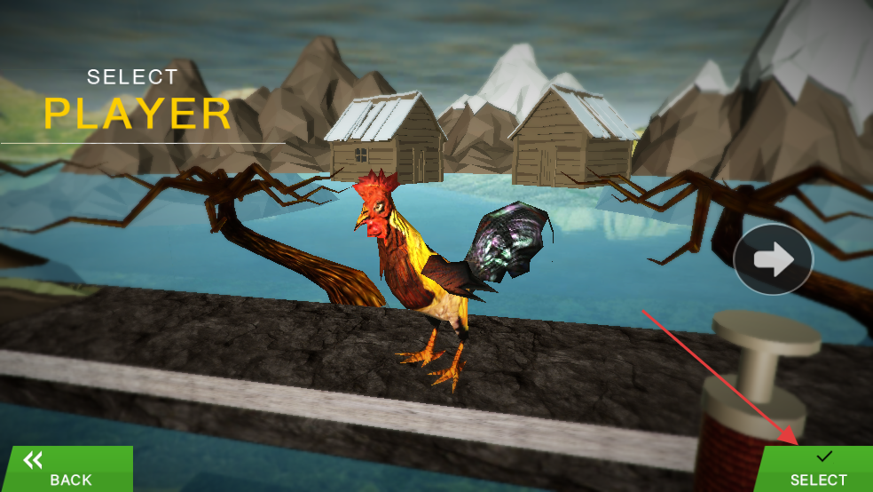 1、在【SELECT-PLAYER】界面,點擊右下角綠色【SELECT】按鈕,選擇公雞角色開始游戲。