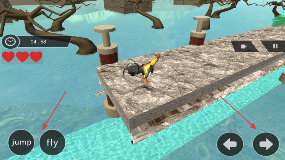 2、游戲中利用左下角【jump】【fly】按鈕和右下角方向鍵,操控公雞在石臺上移動,注意時間限制。