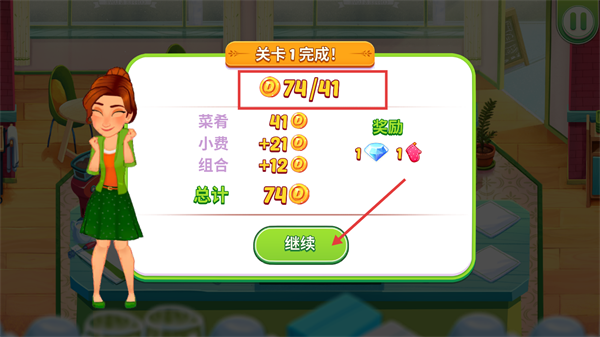 4、【關(guān)卡1】完成后獲得【74】金幣,點(diǎn)擊【繼續(xù)】進(jìn)入下一關(guān)。