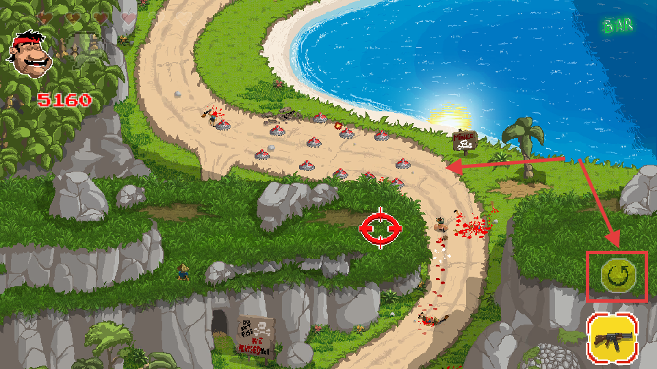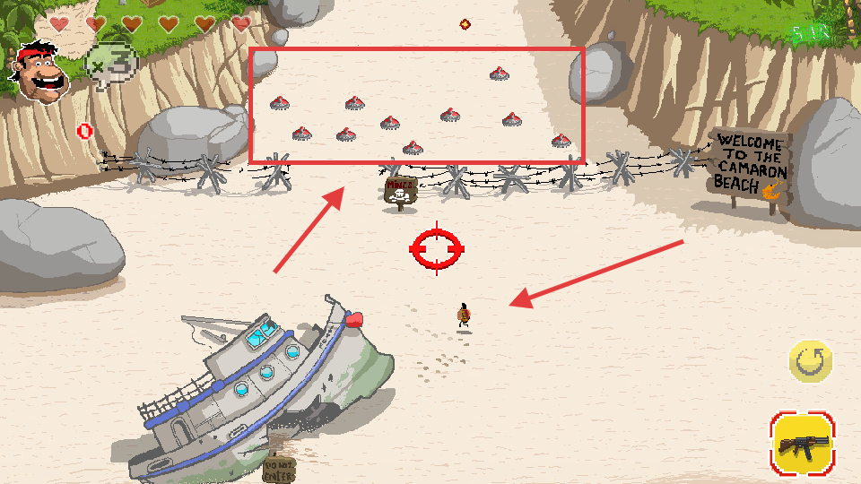 2、進(jìn)入沙灘關(guān)卡,觀(guān)察【地雷】分布規(guī)律,繞開(kāi)后通過(guò)鐵絲網(wǎng),留意前方敵人蹤跡,準(zhǔn)備應(yīng)對(duì)戰(zhàn)斗。