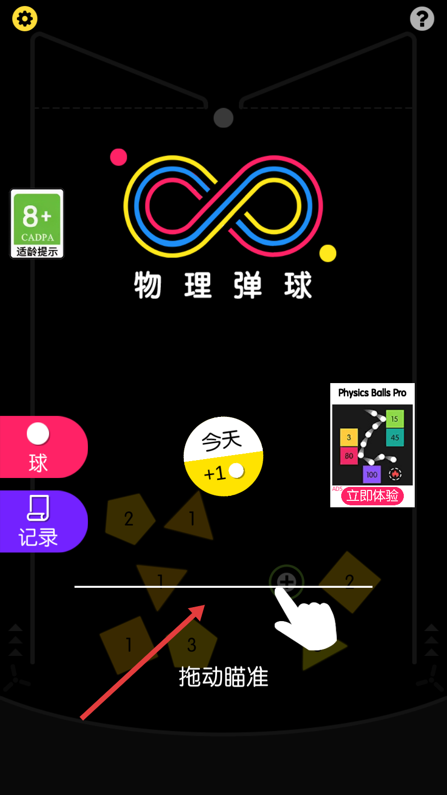 1、進(jìn)入游戲后,按照提示【拖動瞄準(zhǔn)】來發(fā)射彈球,可點(diǎn)擊【球】或【記錄】按鈕查看相關(guān)信息,準(zhǔn)備開始游戲。
