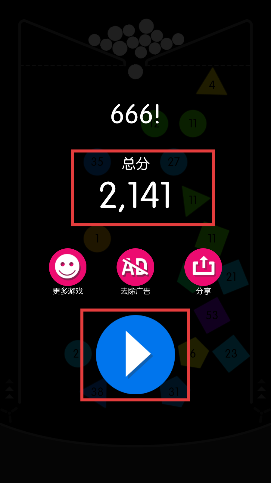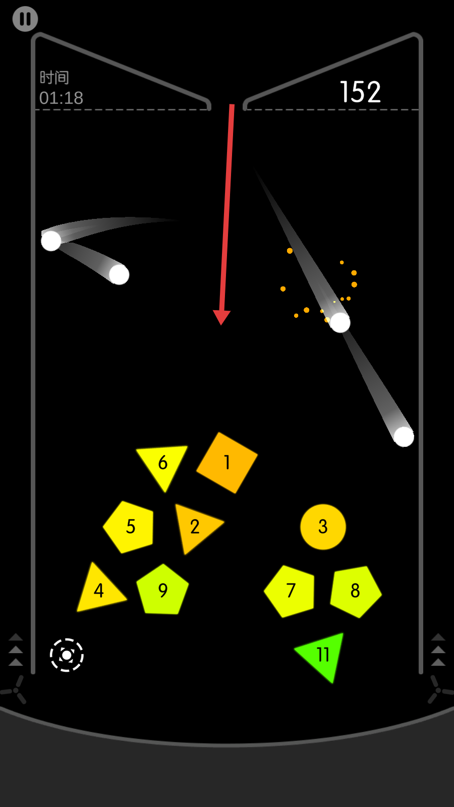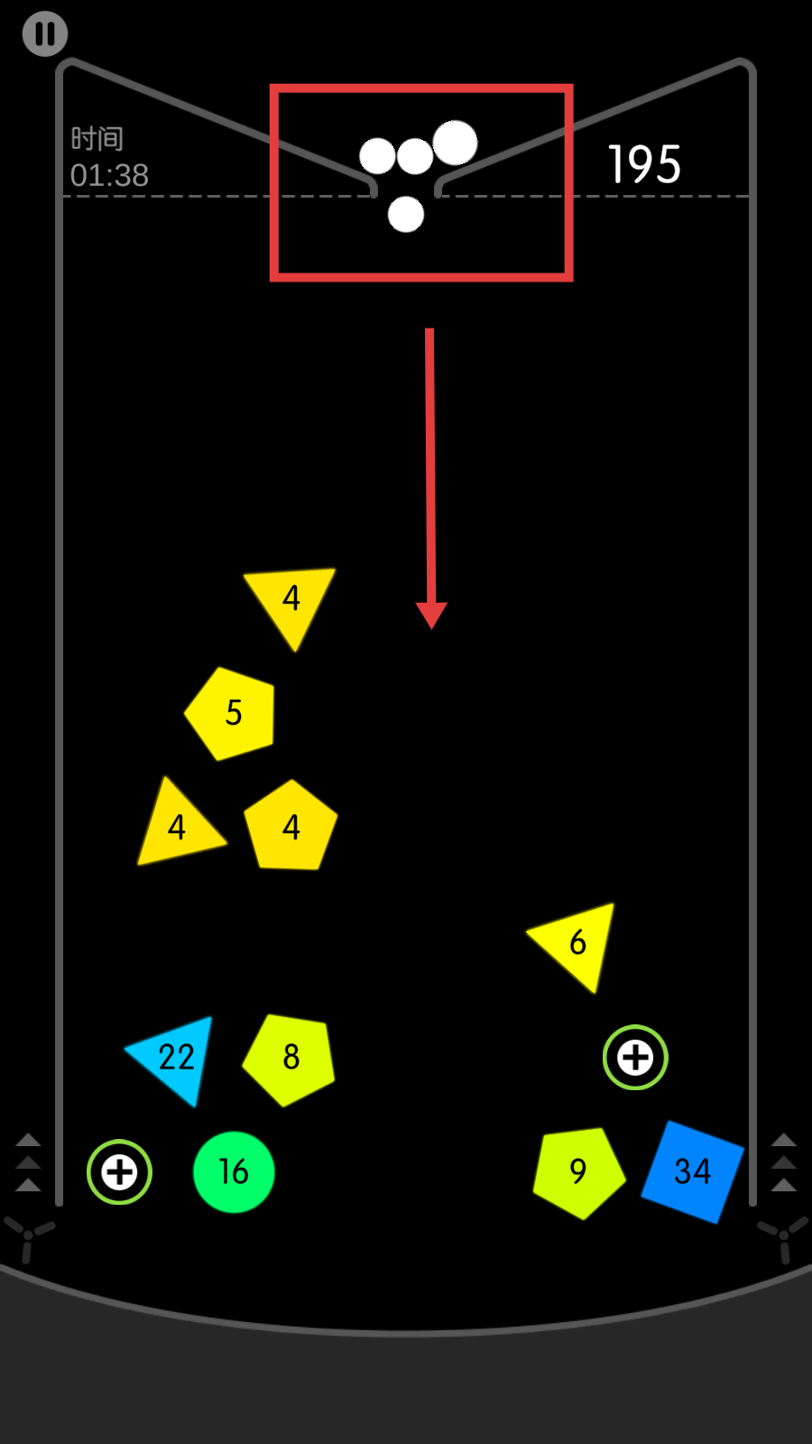 3、盡量讓彈球在上方聚集后再下落,這樣能更高效地?fù)舸蚨鄠€形狀,快速提升分?jǐn)?shù),注意不同形狀的數(shù)字和位置。