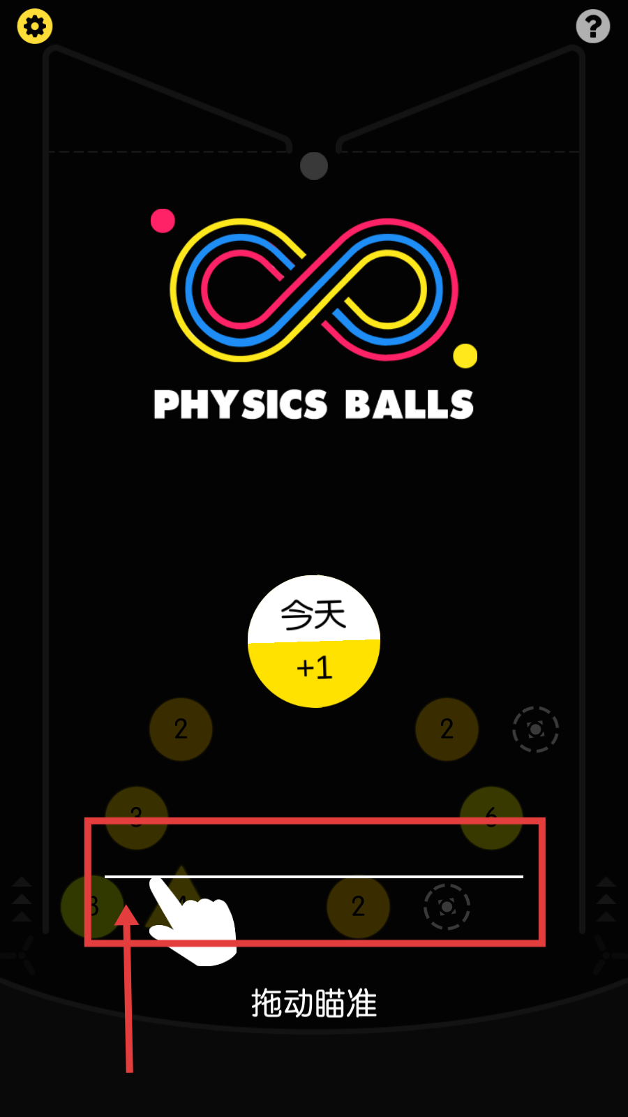 1、進(jìn)入游戲后,按照【拖動(dòng)瞄準(zhǔn)】的提示操作,發(fā)射彈球開(kāi)始游戲,可留意【今天+1】的每日獎(jiǎng)勵(lì)提示。
