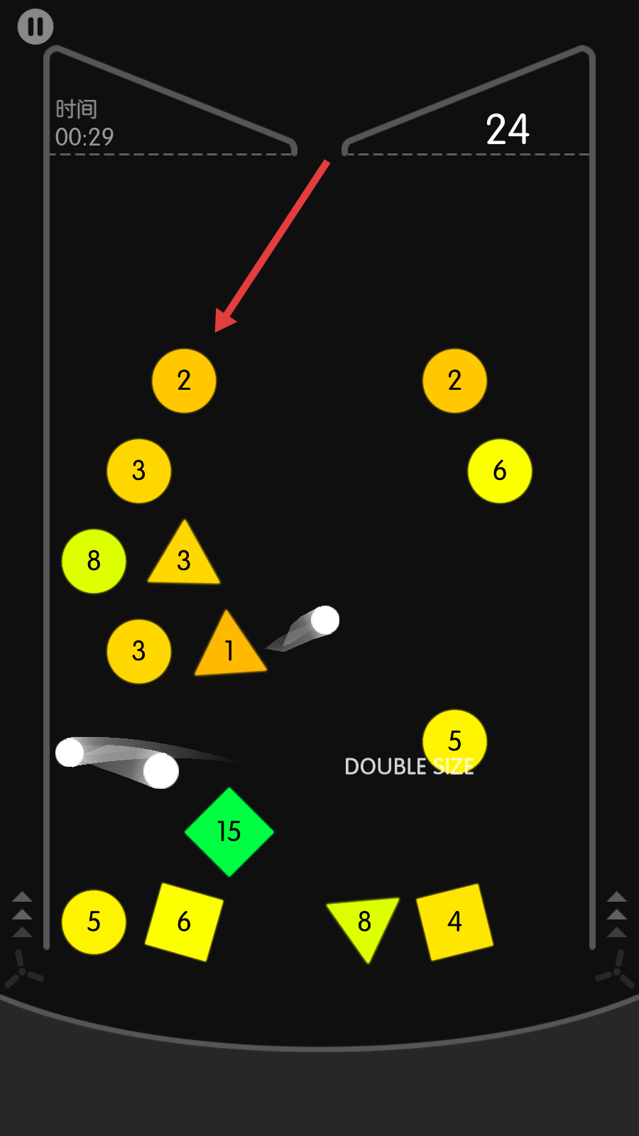 2、彈球會(huì)物理彈射擊打帶有數(shù)字的形狀,形狀數(shù)字代表?yè)舸虼螖?shù),同時(shí)關(guān)注時(shí)間和分?jǐn)?shù)變化,還可留意【DOUBLE-SIZE】等特殊效果。