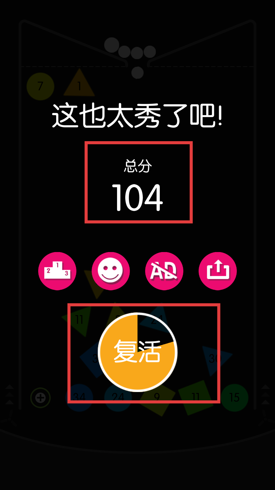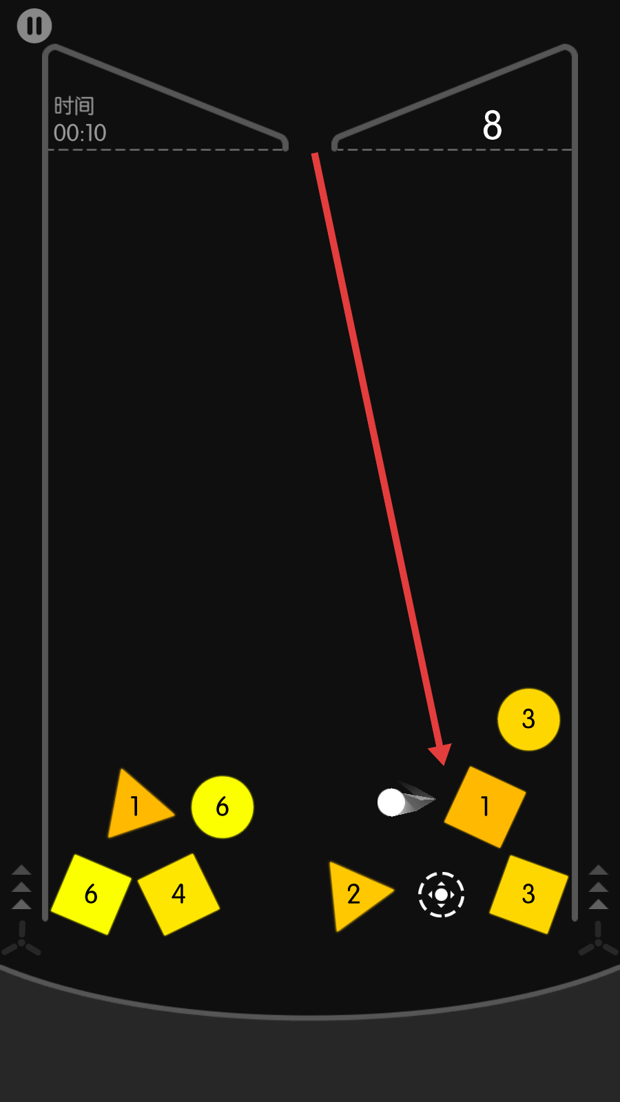 3、瞄準(zhǔn)帶有數(shù)字的形狀,利用彈球物理彈射盡可能多地?fù)舸蛐螤睿源颂嵘謹(jǐn)?shù),注意不同形狀的數(shù)字和位置。