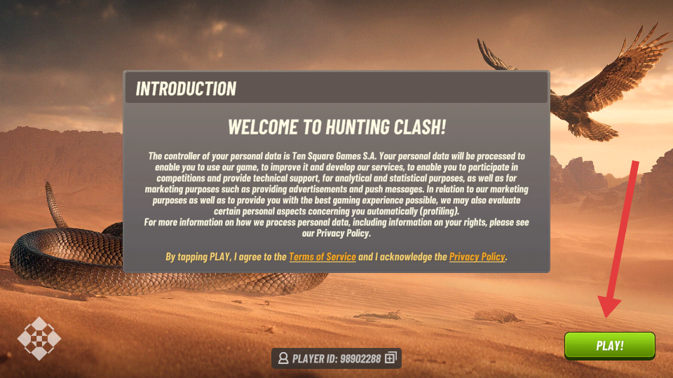 1、進(jìn)入游戲時,點擊【PLAY!】按鈕,同意服務(wù)條款和隱私政策后開始游戲。