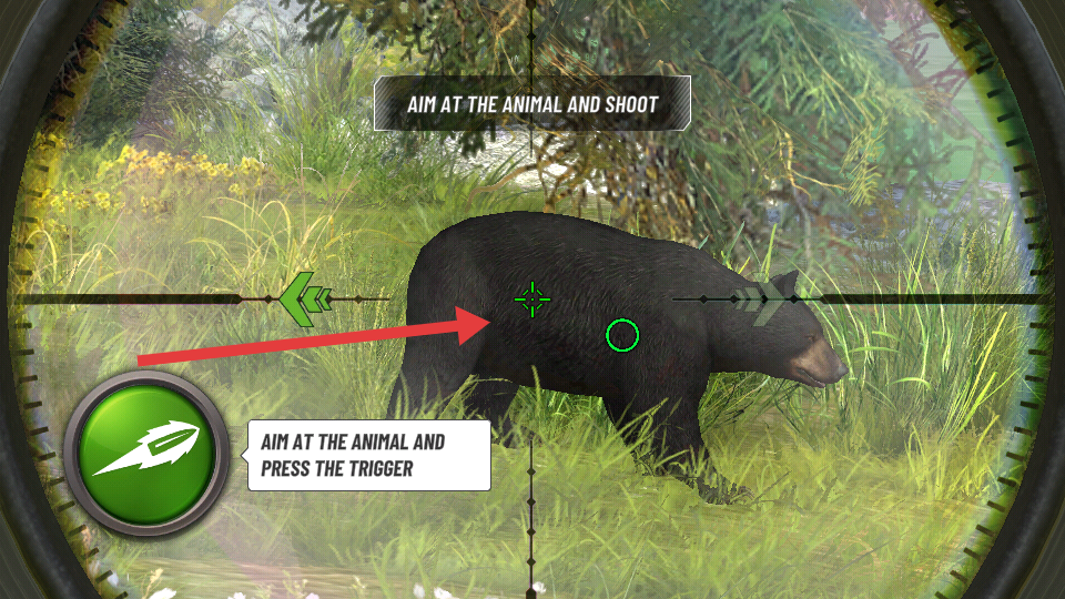 3、狩獵時,瞄準(zhǔn)動物,按照提示按下觸發(fā)鍵射擊,精準(zhǔn)命中目標(biāo)。