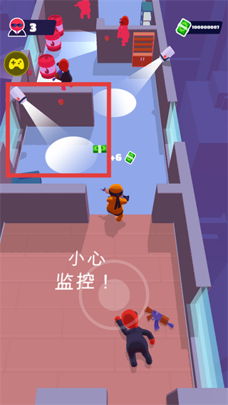 2、行動時注意【監(jiān)控】,避開監(jiān)控視野范圍,同時收集散落的金錢,積累資源。